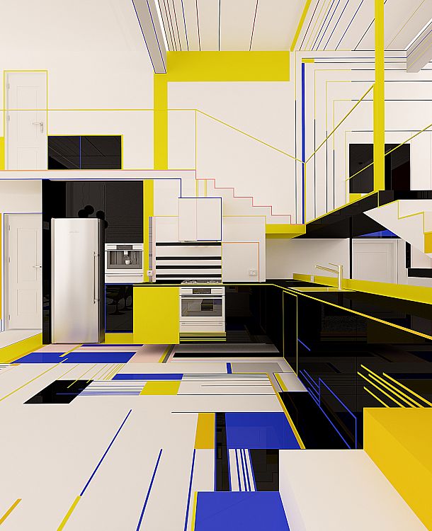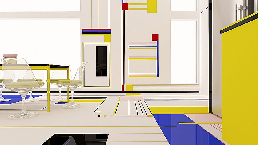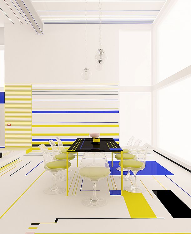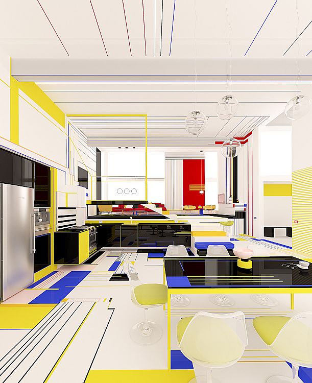 «Своей работой мы хотели бы вызвать у зрителя те же эмоции, что вызывали картины Мондриана. В идеале обитатели квартиры и их гости должны почувствовать себя частью танцевального действа», - говорят авторы. – Это танец форм и цветов, причем черный и белый используются в качестве интервалов. Белый цвет более активен, тогда как черный, наоборот, - пассивен. Танец – форма свободы, он символизирует гармонию души и тела».