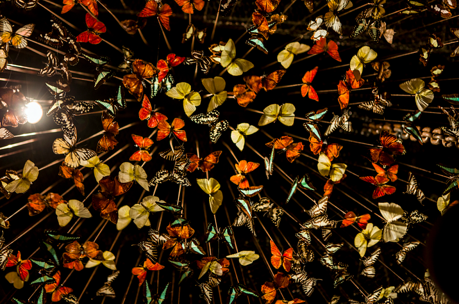 Основные материалы, с которыми работал автор, - это металл, дерево и натуральная кожа. Интерьер насыщен как вполне себе земными, привычными, так и фантастическими, сказочными объектами. Но единственный элемент, вызывающий неизменный восторг посетителей, - декоративное потолочное панно из бабочек, заставляющее завсегдатаев бара постоянно поднимать голову.