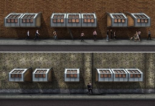 В рамках проекта Space for New Visions архитектором Джеймсом Ферзером (Spatial Design Architects) был продемонстрирован новый проект. Его работа – это объем, который крепится на фасадах зданий; он предназначен для того, чтобы стать убежищем для бездомных. В число положительных сторон сооружения входит абсолютная экологическая чистота.
