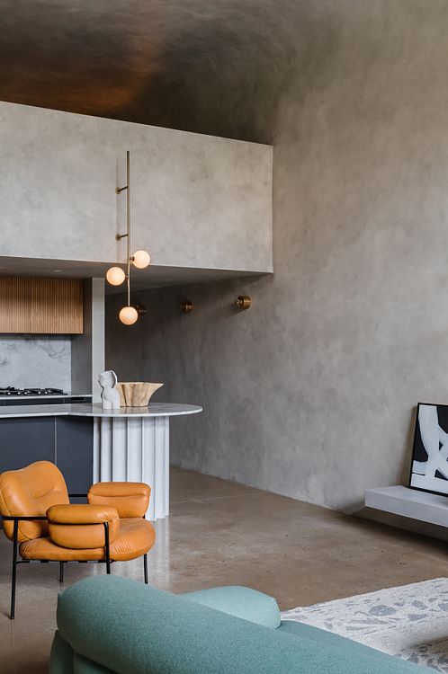 «Пещерный» облик интерьера не должен вводить читателя в заблуждение. Архитекторы использовали такие материалы, как ламинированная клееная фанера, древесина американского дуба, медь и так далее. Да и сам «бетонный монолит», воплощенный в простых геометрических формах, — это на самом деле стеклоармированный бетон (GRC), вполне себе современный практичный материал. Все поверхности в квартире покрыты декоративной отделкой French Wash, имитирующей фактуру крупнозернистой затирки.