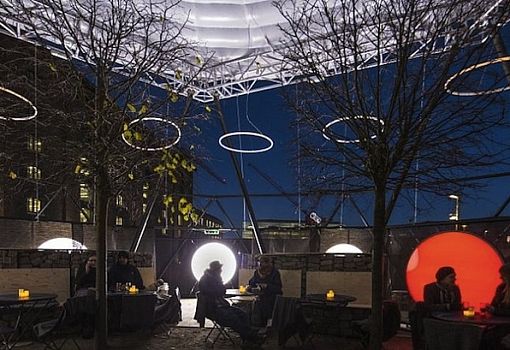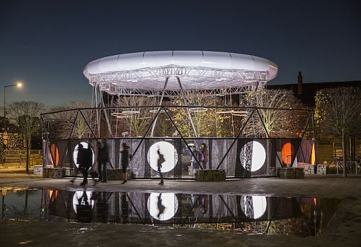 В Лондоне с 6 декабря до середины января можно будет посетить тематический павильон-инсталляцию Winter Sun, которая расположена под открытым небом в районе Кингс-Кросс. Приземистый цилиндр призван передать красоту небесного светила в разное время суток – во время восхода, заката, в зените. «Стадии» Солнца материализованы благодаря крупным круглым светильникам и большому светоотражающему диску, закрепленному над всей конструкцией. Светочувствительные материалы позволяют создать теплую атмосферу внутри открытого пространства, которое используется в качестве кафе.