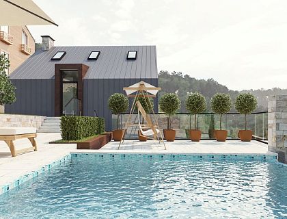 Нам удалось расположить здания таким образом, что оба дома имеют все необходимые функциональные зоны для комфортной загородной жизни семьи из 5 человек. Небольшие габариты участков нам удалось компенсировать наличием эксплуатируемой кровли с роскошными видами на море, горные пейзажи и панораму города. Паркинг на 2 машино-места с прекрасными видовыми характеристиками является эксплуатируемой кровлей уютной зоны патио на нижнем уровне участка.