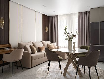 Эту квартиру купили с уже готовым ремонтом. Но, пожив в ней немного, хозяева решили все переделать. Им нужен был респектабельный, в меру роскошный интерьер с интересными деталями. Это авторский проект разработанный лично Анастасией Вивенцовой. Анастасия перекроила планировку, сделав ее более функциональной, произвели демонтаж стен, сантехники, электрики, сделали шумоизоляцию, поменяли остекление, входную дверь.