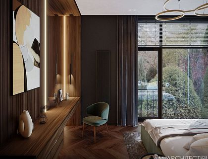 Авторы: Екатерина Каретина, Александр Мельниченко. Создана атмосфера уюта, сочетающаяся с классической строгостью в современном прочтении, перетекающие пространства, отсутствие лишних перегородок и дверей. Светильники, мебель, потолочные ниши - выполнены в бионической стилистике с плавными закругленными углами. Вкрапления латунных элементов освещения и декора "под золото" - создают композиционные акценты.