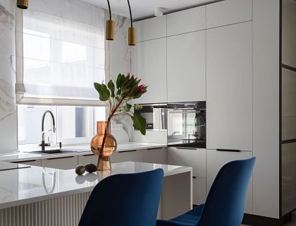 Этот интерьер своего рода мини резиденция для своих хозяев, которые проживают в просторном загородном доме и используют эту квартиру для гостевых визитов к детям. Поэтому в этом интерьере мы перенесли классическое настроение и тонкие нюансные сочетания, чтобы интерьер выглядел актуально как можно дольше.