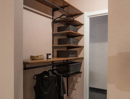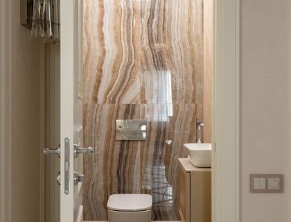 Клиенты покупали этот дом с готовой отделкой, перед началом проектирования напольные покрытия, двери, керамогранит в санузлах должны были быть сохранены. В итоге к этой базовой отделке мы добавили нейтральные оттенки фона и яркие акценты. Зону лестницы выделили неубиваемыми панелями из полиуретана в сочетании с керамогранитом. Вся общая зона — проходной коридор, кухня и гостиная выполнены в одних материалах — что делает пространство едиными стилистически и в то же время уютным.