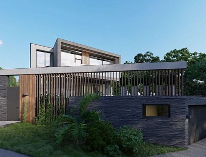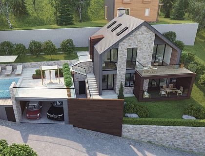 Villa Neoshale — проект ArchiNova Studio в Мацесте, где классический стиль шале получил современное прочтение. Мы совместили его с минимализмом, подчеркнули пластику панорамными витражами и создали лаконичный образ, органично вписанный в горный ландшафт. Фасады выполнены в комбинации белой камешковой штукатурки и натурального камня, что придало архитектуре элегантность и выразительность.