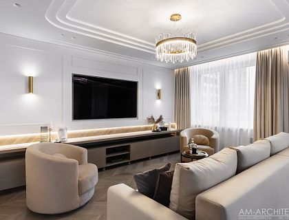 Проект разработан в стилистике современной скандинавской эстетики, где акцент делается на просторные, наполненные светом пространства, натуральные текстуры и качество материалов. Чистые белые поверхности стен и потолков служат нейтральным фоном, уравновешенным акцентными покрытиями с выраженной текстурой дерева. Гармоничное взаимодействие естественного и сценарного искусственного освещения. Свет подчеркивает фактуру отделочных материалов, создавая теплую атмосферу и ощущение единения с природой.