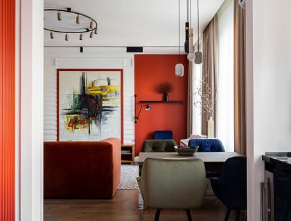 Приватный интерьер с ярким характером. Мы объединили зону кухни и гостиной в студийное пространство, добавили мастер-спальню с отдельной ванной и гардеробной.