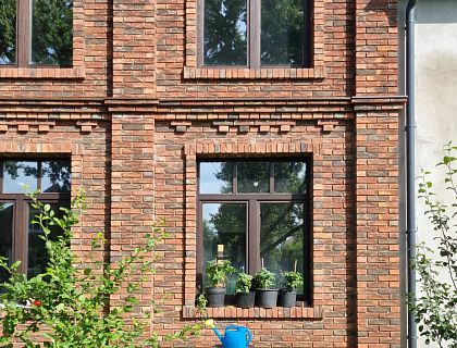Проект двухэтажного дома из теплой керамики Поротерм с гаражом, террасой и четырьмя спальнями. Фасад отделан кирпичом ручной формовки, планкеном из лиственницы и штукатуркой.
