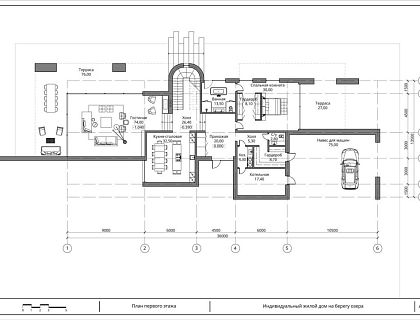 Проект двухэтажного загородного дома из монолитного железобетона площадью 1000 м.кв. с плоской кровлей и панорамным остеклением. Участок — лесной массив в пригороде Санкт-Петербурга. Встроенный гараж на 3 автомобиля. Отделка фасада: материалы в серых, рыжих и земляных тонах, гармонирующие с ландшафтом. 1-й этаж — общественная зона: гостиная, кухня, кабинет, детская игровая, спортзал, гостевая спальня. 2-й этаж — приватная зона: два блока мастер-спален + две детские комнаты.