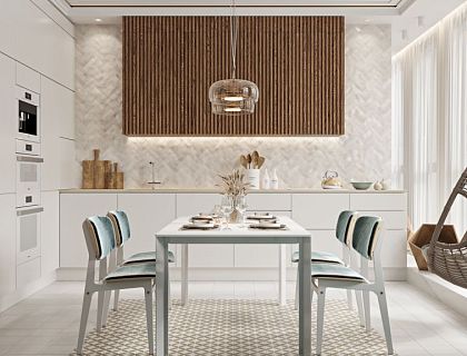 Просторная квартира, с чудесными панорамными окнами и видом с высоты птичьего полета. Площадь помещения более 150 квадратных метров, на которых проживает дружная семья: мама, папа и дочка. Архитектурой дома задаются плавные линии, которые отразились в самом главном пространстве квартиры - зоне столовой и гостиной. Проект был тщательно продуман и проработан так, что бы восприятие от интерьера было легким, комфортным, но при этом достойным и интересным.