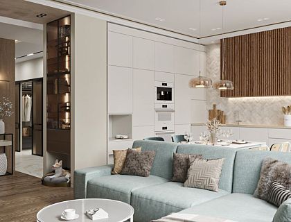 Проект был разработан для молодой амбициозной пары, ценителей натуральных материалов и смелых решений по оформлению своего дома. В общение мы быстро поняли стилистику будущего интерьера - это был не индустриальный лофт, а домашний, сложный и уютный интерьер. Натуральное дерево стало основой в отделке интерьера, а в дополнении к нему мы использовали камень, бетон, металл. Правильная пропорция каждого из используемых материалов подарила нам уникальный интерьер, наполненный теплом и любовью.